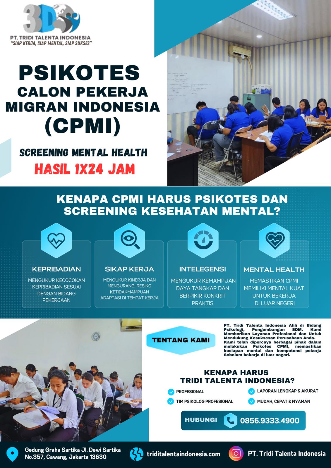Tes psikologis merupakan bagian penting untuk proses seleksi calon pegawai migran Indonesia. Tujuan dari adanya tes psikologi dalam proses seleksi CPMI adalah untuk memastikan bahwa CPMI tidak hanya memiliki keterampilan teknis, namun juga kesiapan mental, emosional, dan intelektual ketika bekerja di lingkungan yang berbeda. Ada beberapa hal yang perlu dilakukan agar CPMI memiliki hasil yang maksimal dan psikotes diantaranya fokus atau konsentrasi dan memiliki kepercayaan diri maupun optimisme ketika mengerjakan, hal ini akan memberikan energi positif dalam diri CPMI. Rasa percaya diri dan optimisme akan membuat kemampuan berpikir menjadi lebih jernih sehingga ketika melakukan psikotes dengan maksimal. Selain itu persiapan yang matang baik dari segi teknis dan mental juga perlu diingat ketika akan melakukan psikotes. Lembaga Psikologi TRIDI TALENTA INDONESIA bisa menjadi pilihan yang tepat untuk tes psikologi bagi Anda yang sedang menjalani proses tahap seleksi Calon Pegawai Migran di Indonesia.